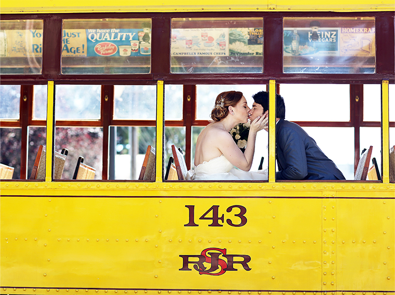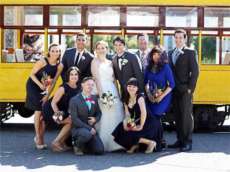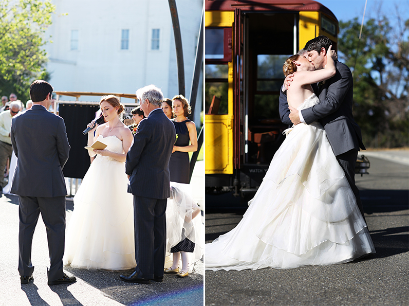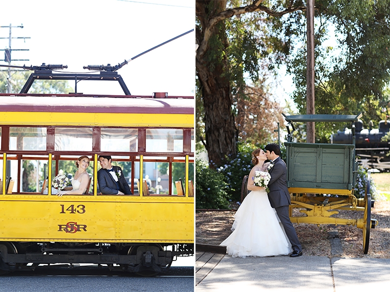 Rachel & Geoff had a wedding celebration of a lifetime with their family & friends. They were already legally married but wanted to have a fun wedding celebration with all of their family & friends. The party was held at San Jose History Park-a giant park with old buildings that just oozes with vintage charm. A yellow trolley drove the couple & their bridal party to the ceremony and they had the ceremony right in front of the trolley. Some guests played croquet, giant Jenga and bean bag toss while others sat on the lawn and enjoyed the beautiful day. Dessert was served by Rachel & Geoff themselves, who had an ice cream cart for the reception! Music filled the air while guests played lawn games. Kids played tag on the lawn. Guests filled bags full of candy from the candy station. And most importantly, the couple enjoyed the company of all the people they love the most. Every part of their day was fabulous! It was truly a fun, special day for all in attendance.